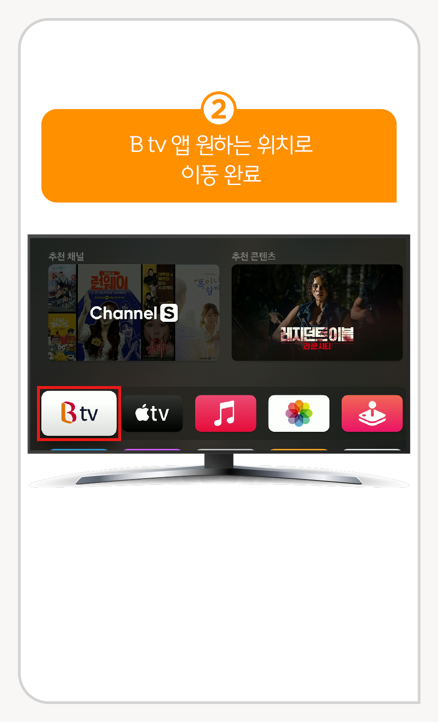 ① 리모컨의 [클릭패드 중앙]을 길게 누름, B tv 앱이 흔들리면, 흔들리는 앱을 리모컨의 [클릭패드 위쪽] 선택 후 이동