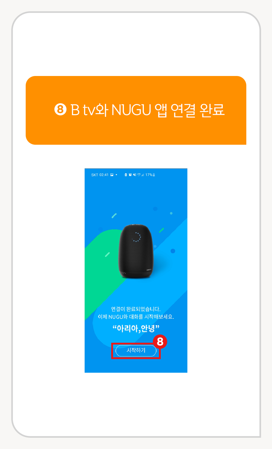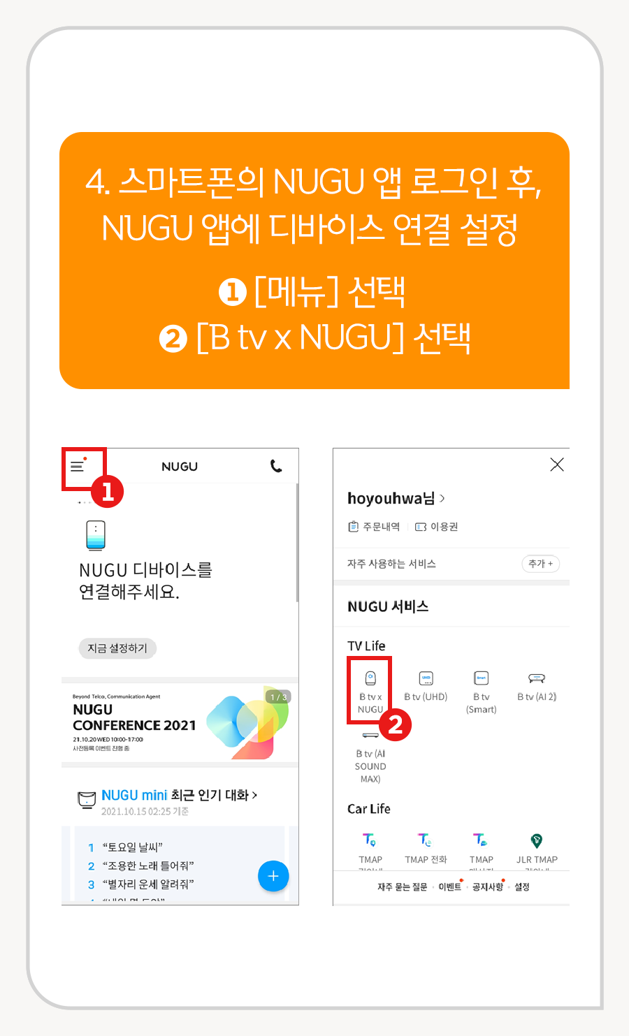 4. 스마트폰의 NUGU 앱 로그인 후, NUGU 앱에 디바이스 연결 설정