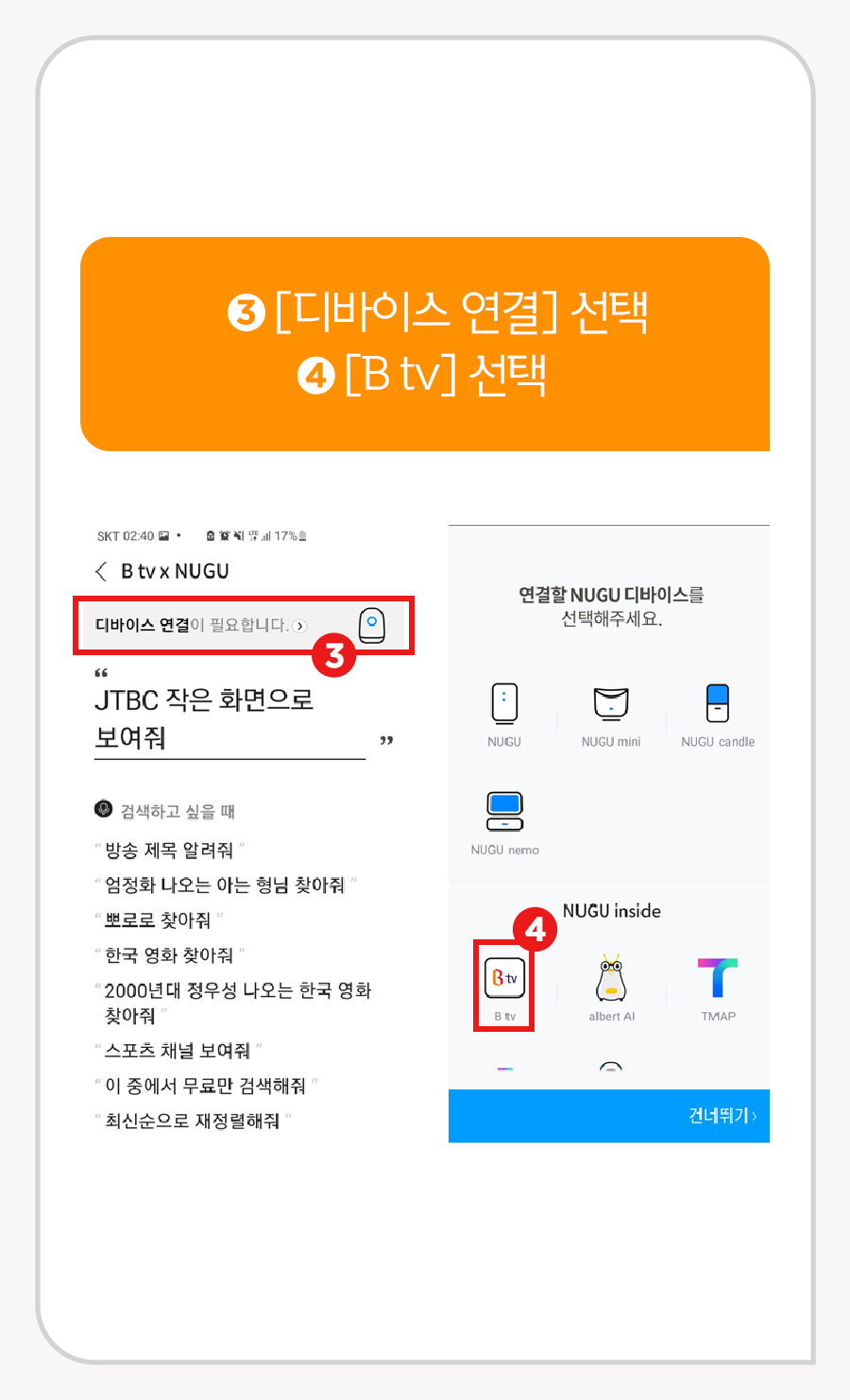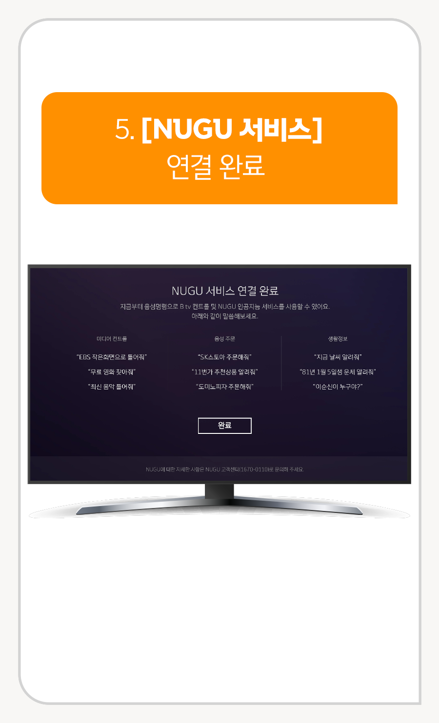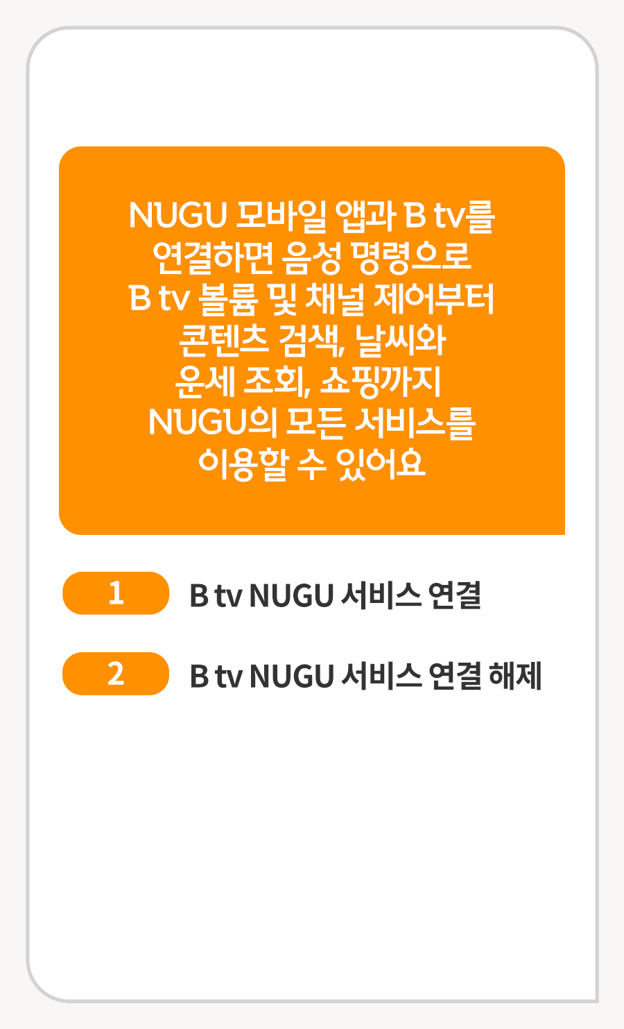 NUGU 모바일 앱과 B tv를 연결하면 음성 명령으로 B tv 볼륨 및 채널 제어부터 콘텐츠 검색, 날씨와 운세 조회, 쇼핑까지 NUGU의 모든 서비스를 이용할 수 있어요.