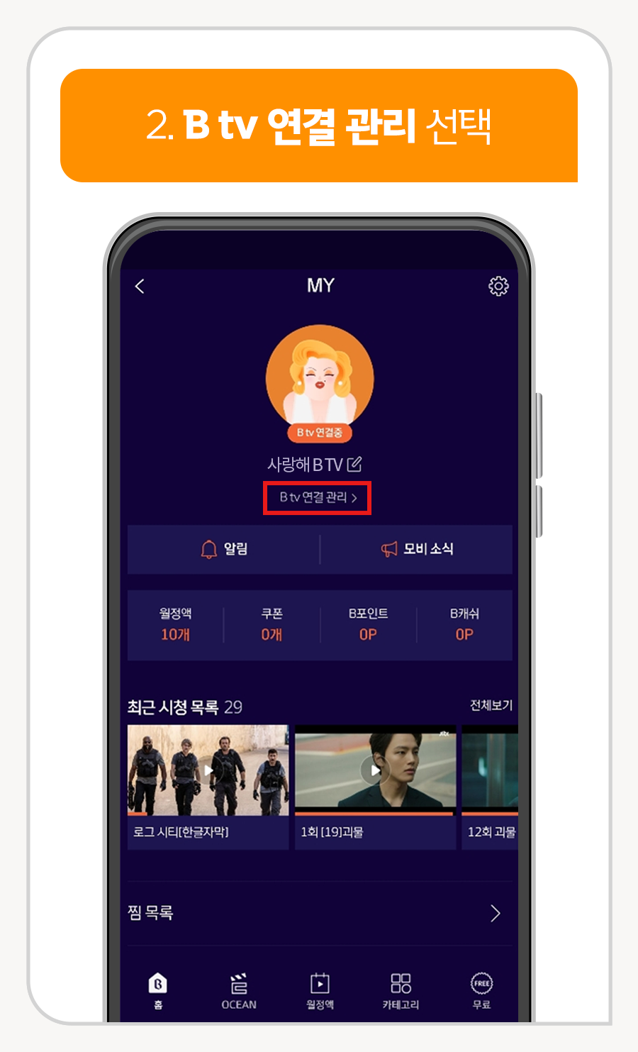 B tv 홈 > MY > 설정 > 모바일 B tv연결