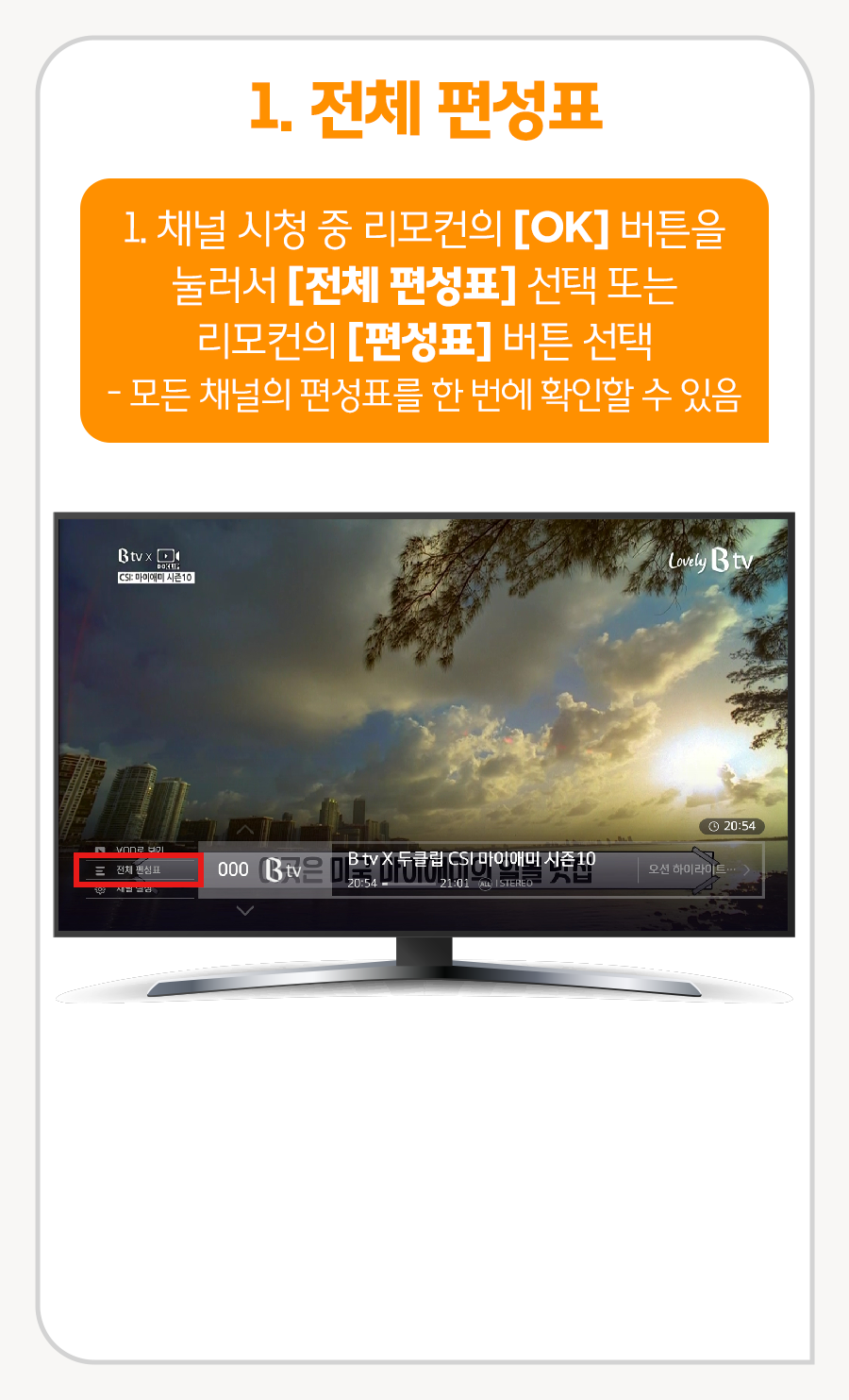 1. 채널 시청 중 리모컨의 [OK] 버튼을 눌러서 [전체 편성표] 선택 또는 리모컨의 [편성표] 버튼 선택