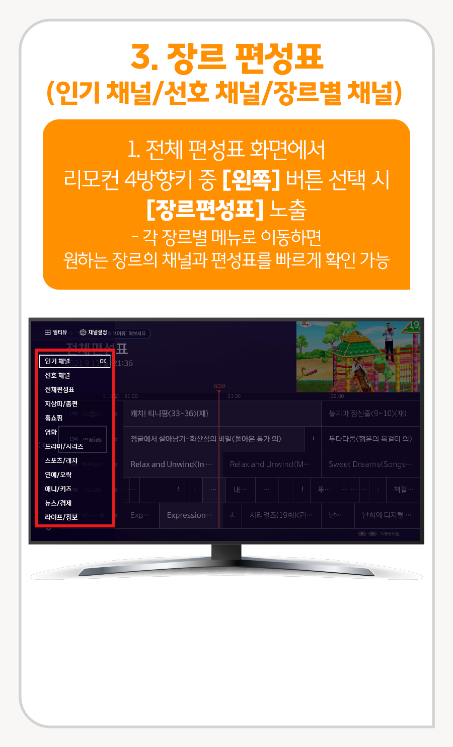 3. 장르 편성표 (인기 채널/선호 채널/장르별 채널)