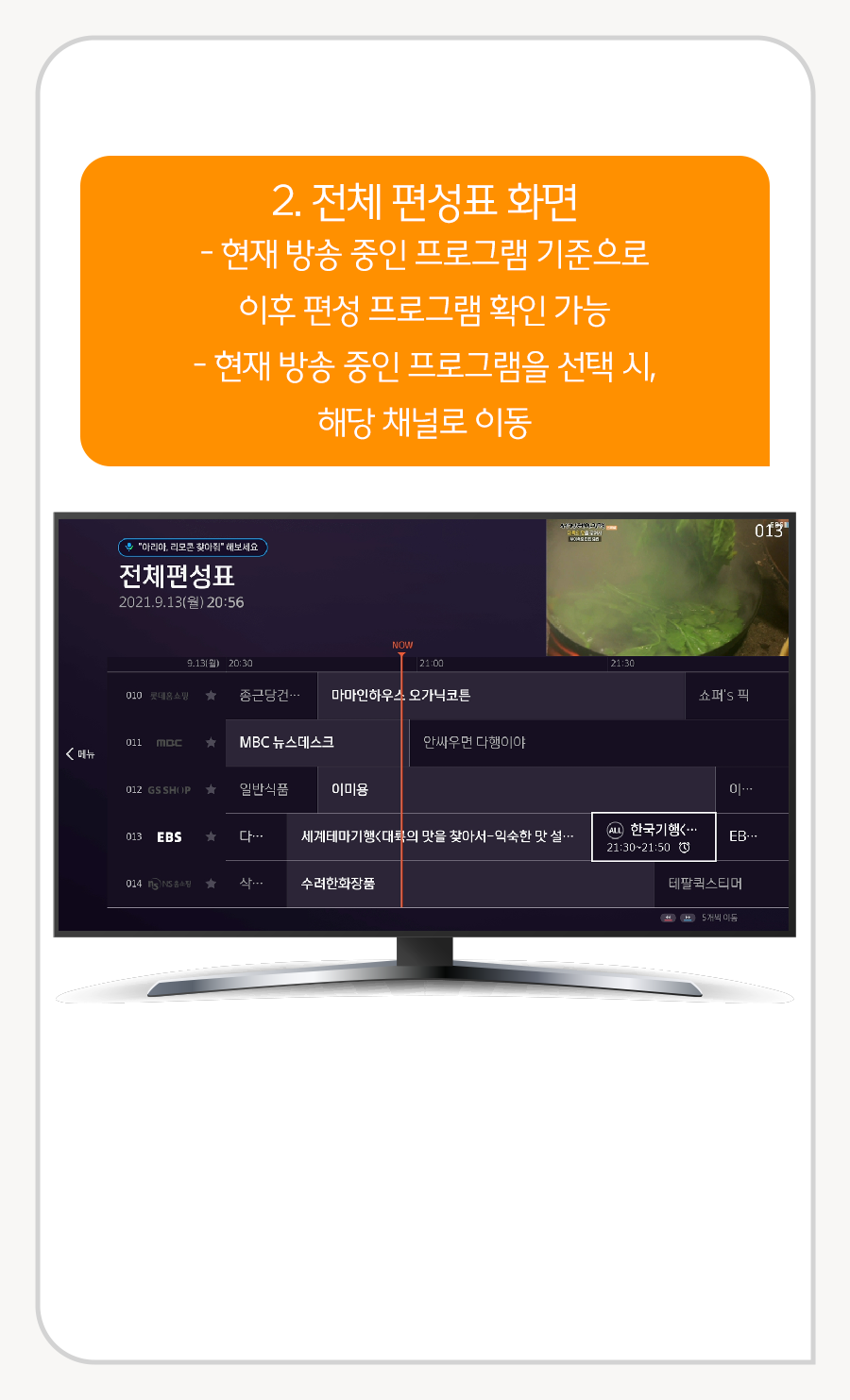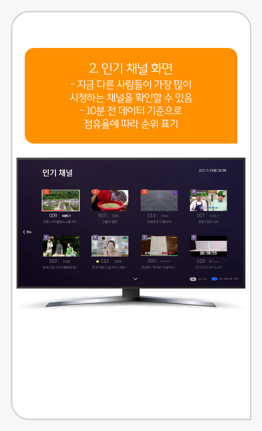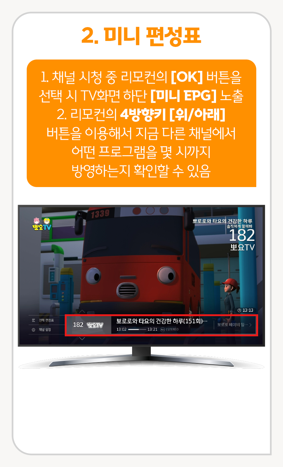 2. 리모컨의 4방향키 [위/아래] 버튼을 이용해서 지금 다른 채널에서 어떤 프로그램을 몇 시까지 방영하는지 확인할 수 있음