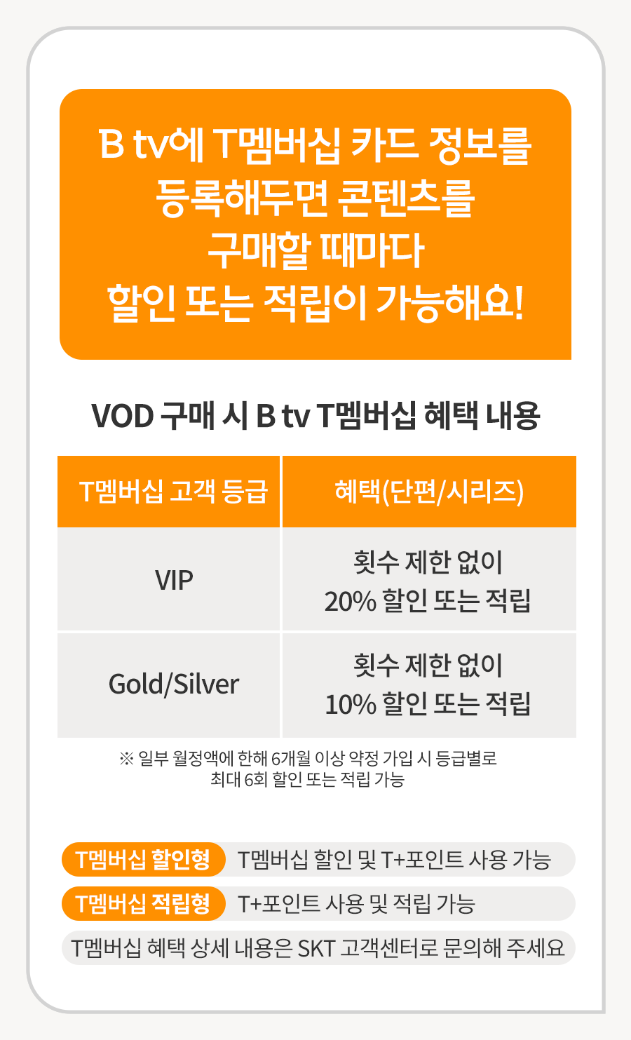 B tv에 T 멤버십 카드 정보를 등록해두면 콘텐츠를 구매할 때 마다 할인을 받을 수 있어요!
