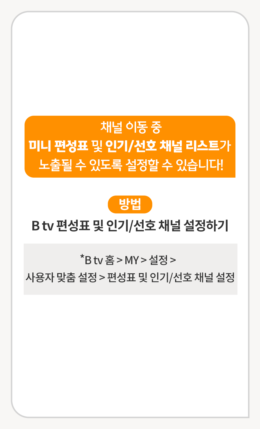 B tv 홈 > MY > 설정 > 사용자 맞춤설정 > 편성표 및 인기/선호 채널 설정