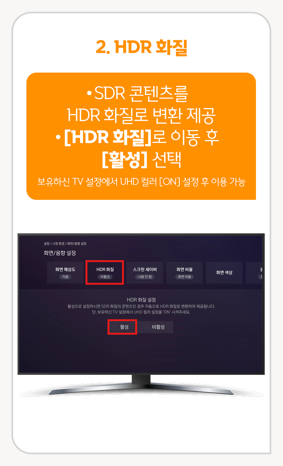 보유하신 TV 설정에서 UHD 컬러 [ON] 설정 후 이용 가능