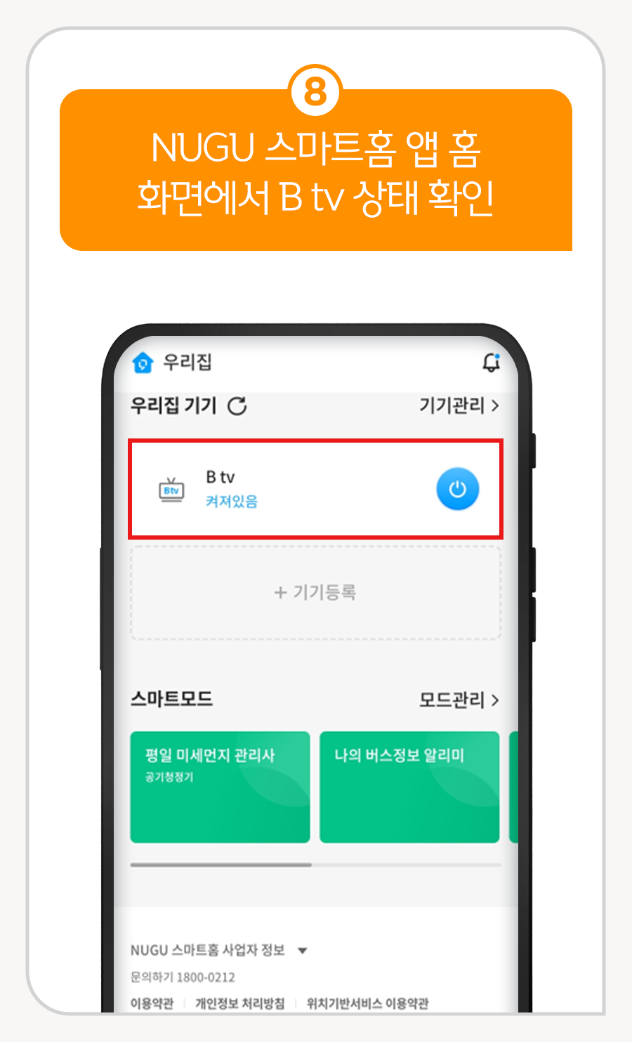 ⑧ NUGU 스마트홈 앱 홈 화면에서 B tv 상태 확인