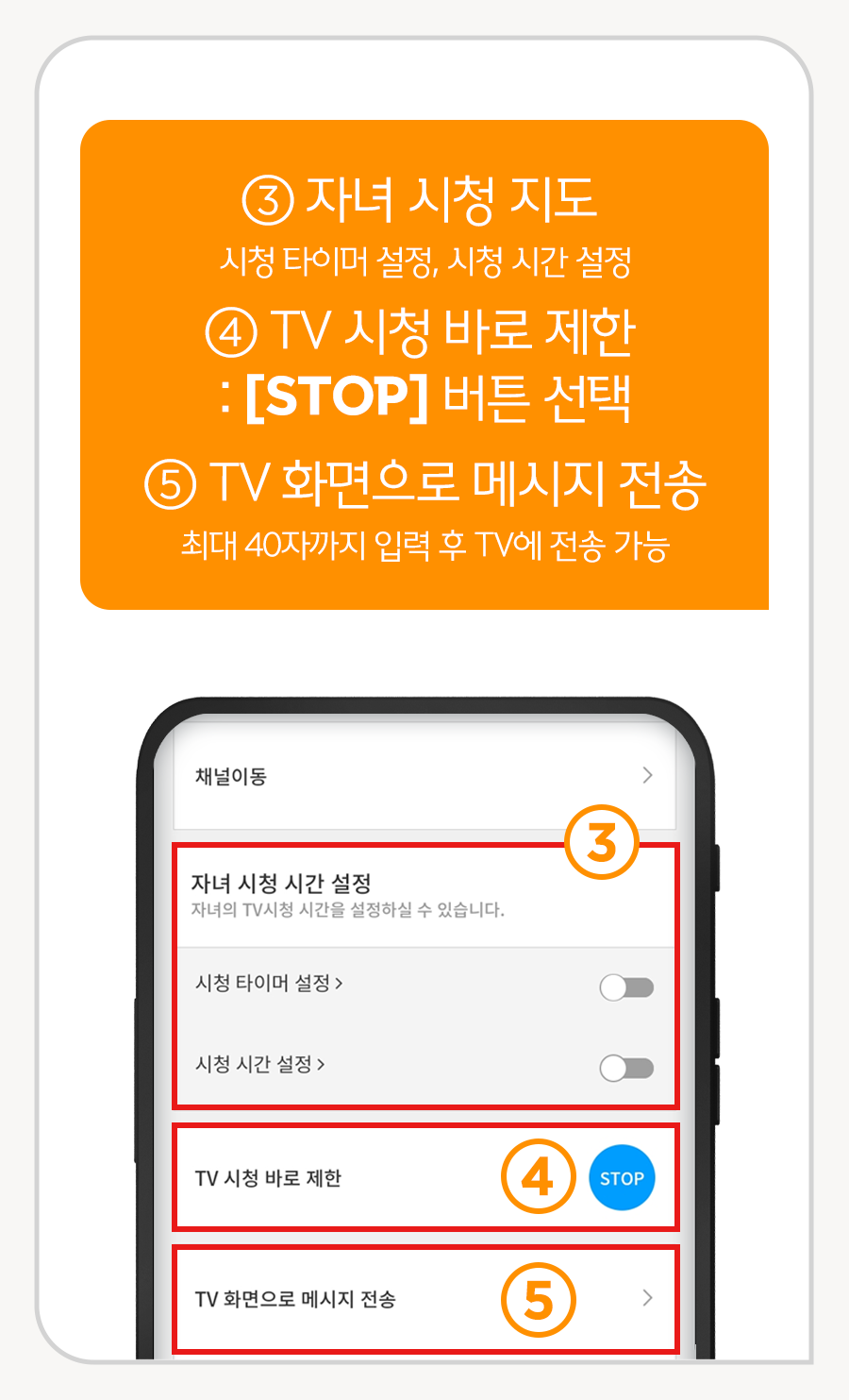 ⑤ TV 화면으로 메시지 전송 : 최대 40자까지 입력 후 TV에 전송 가능