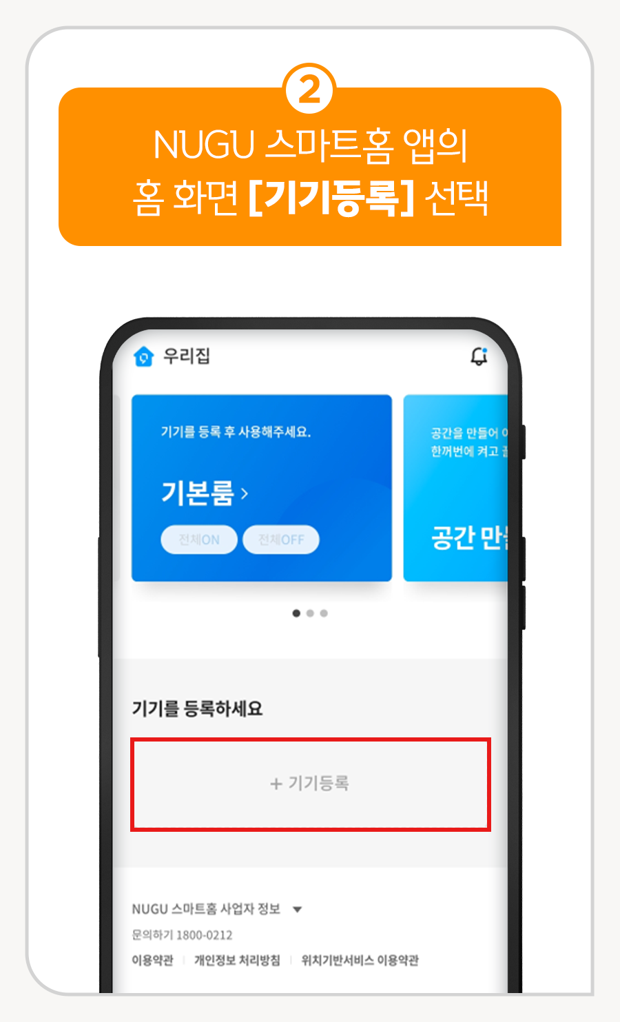 ② NUGU 스마트홈 앱의 홈 화면 [기기등록] 선택