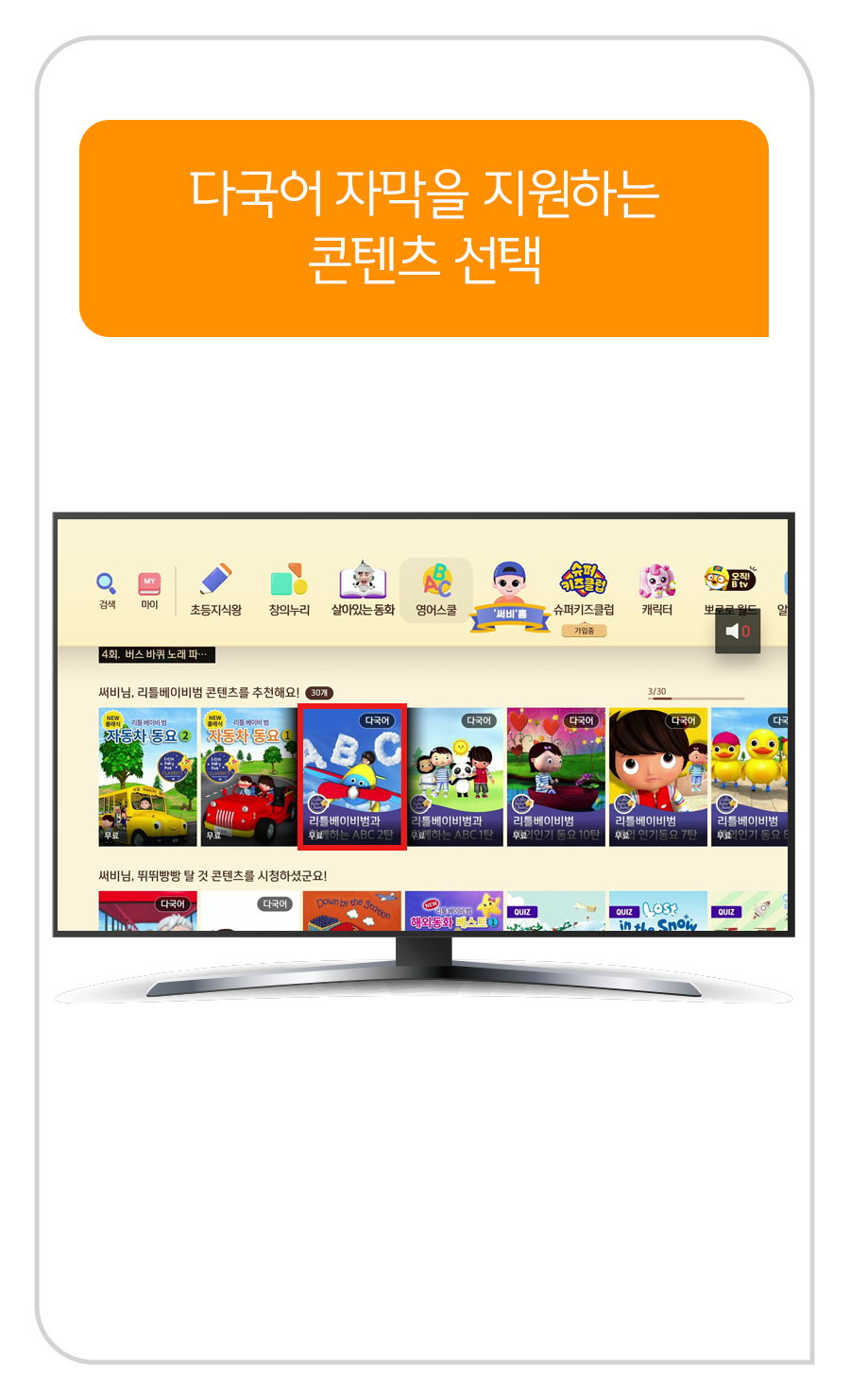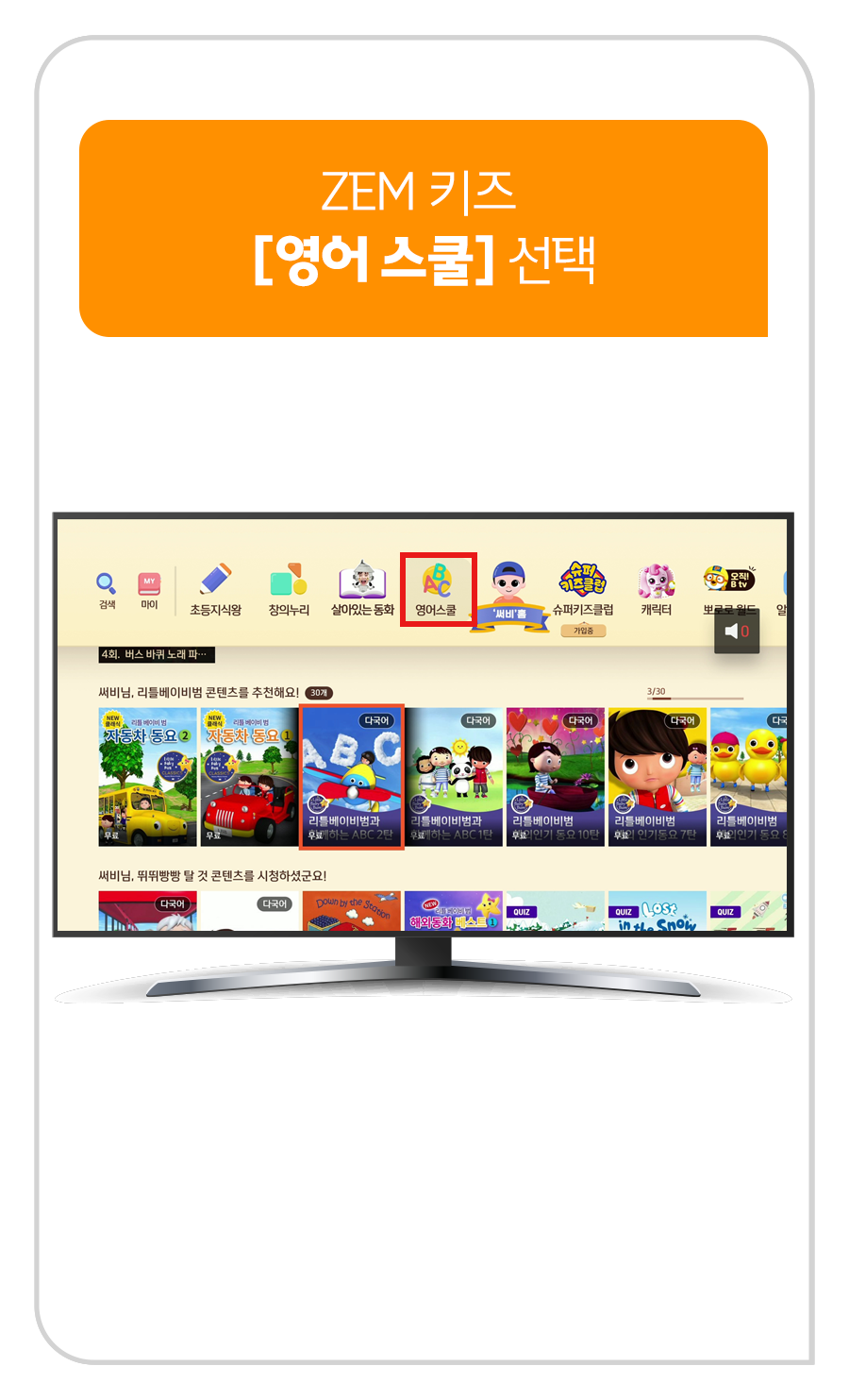 다국어 자막 서비스가 제공되는 B tv ZEM 콘텐츠를 통해 영어로 듣고, 영어로 보거나 한글로 보는 등 아이의 수준에 맞게 자막을 끄거나 켤 수 있어요.