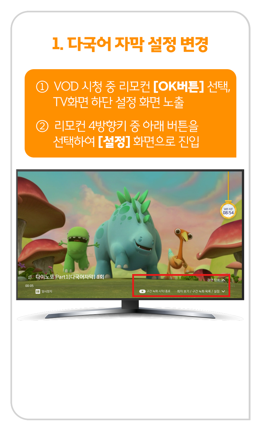 ① VOD 시청 중 리모컨 [OK] 버튼 선택, TV 화면 하단 설정 화면 노출