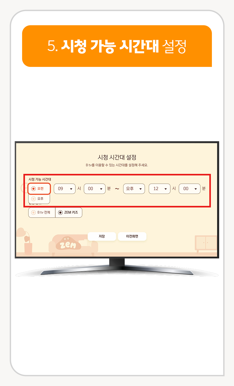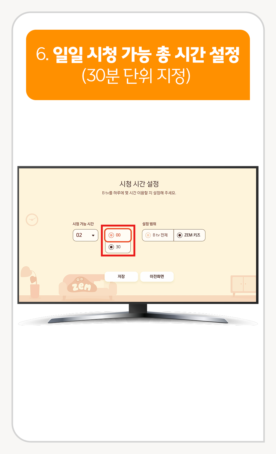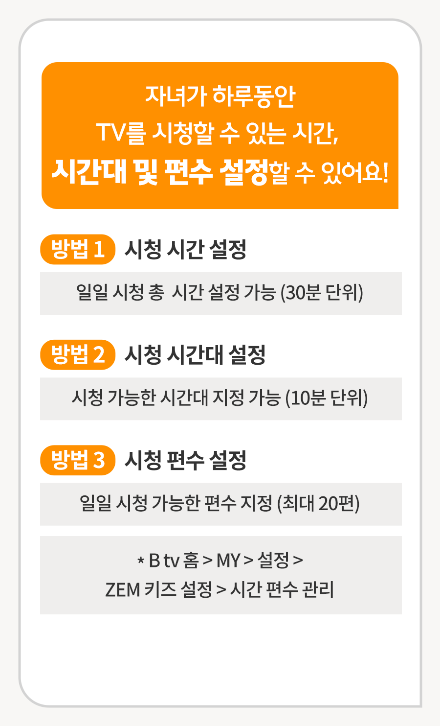 * B tv 홈 ▶ MY ▶ 설정 ▶ ZEM 설정▶ 시간 편수 관리
