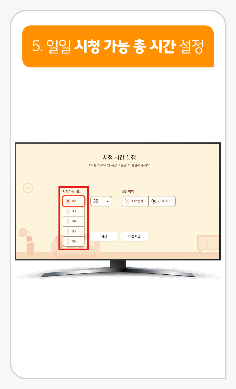 자녀가 하루 동안 TV를 시청할 수 있는 시간, 시간대 및 편수 설정할 수 있어요!