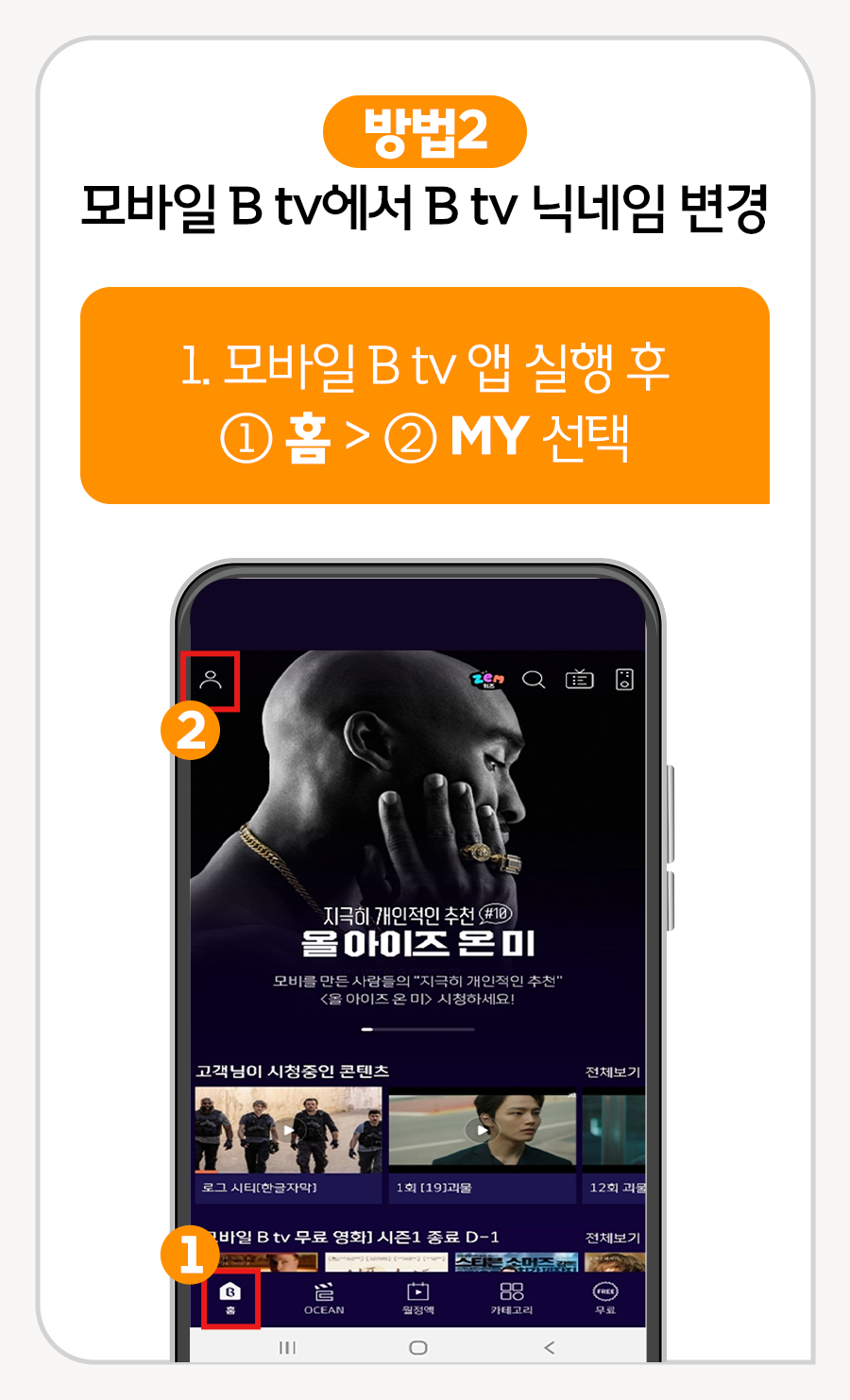 1. 모바일 B tv 앱 실행 후 [홈] ▶ [MY] 선택