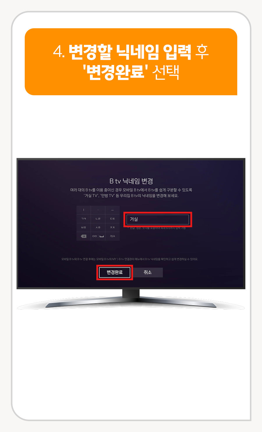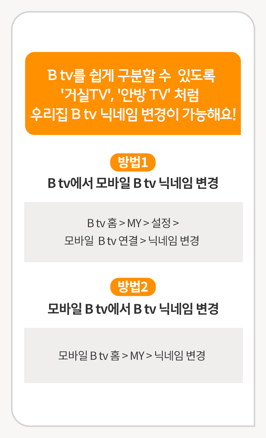B tv를 쉽게 구분할 수 있도록 '거실TV', '안방 TV'처럼 우리집 B tv 닉네임 변경이 가능해요!