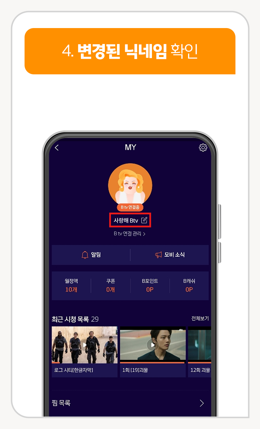 2. 모바일 B tv에서 B tv 닉네임 변경