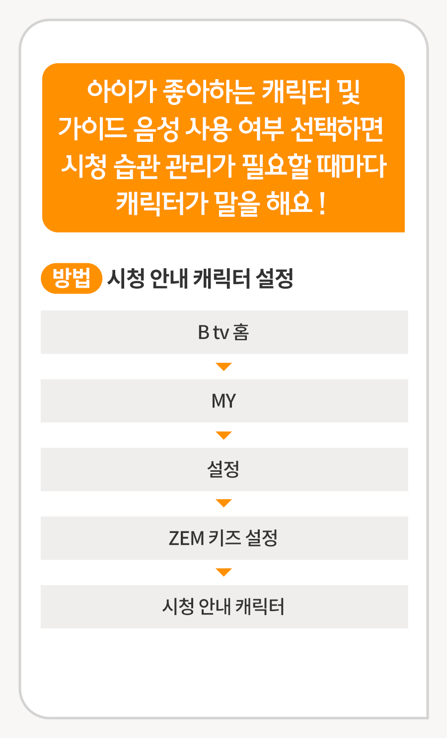 시청 안내 캐릭터 설정 방법 : B tv 홈 ▶ MY ▶ 설정 ▶ ZEM 설정 ▶ 시청 안내 캐릭터