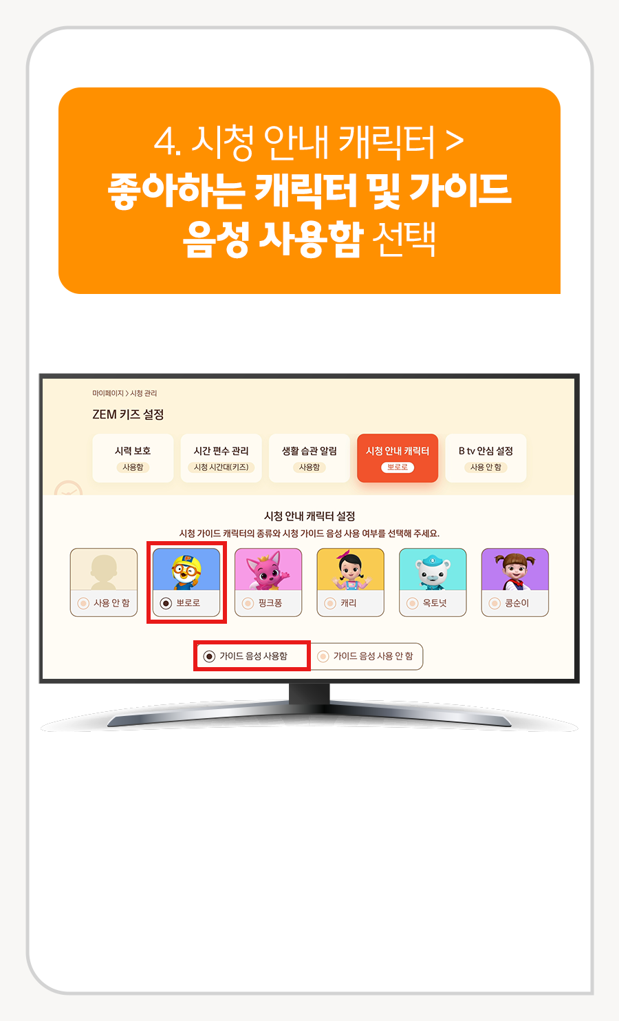 아이가 좋아하는 캐릭터 및 가이드 음성 사용 여부 선택하면 시청 습관 관리가 필요할 때마다 캐릭터가 말을 해요!