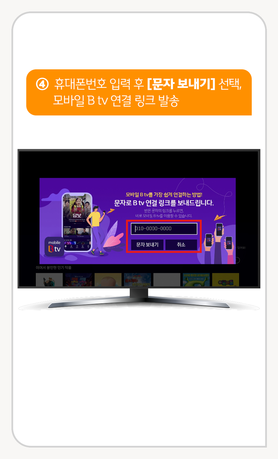 ④ 휴대폰번호 입력 후 [문자 보내기] 선택, 모바일 B tv 연결 링크 발송