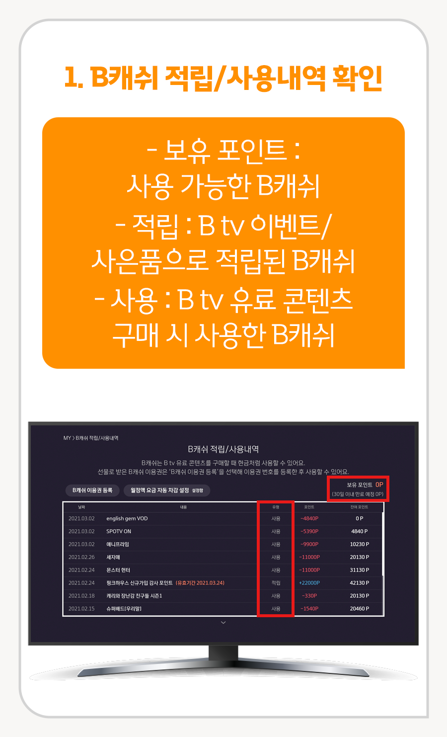 - 적립 : B tv 이벤트/사은품으로 적립된 B캐쉬