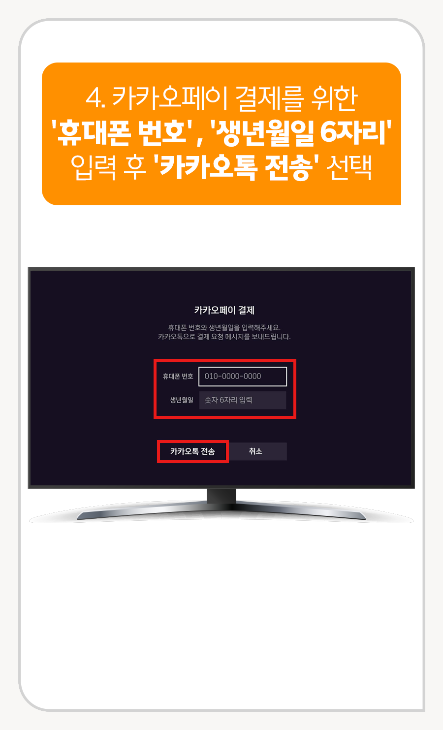 4. 카카오페이 결제를 위한 '휴대폰 번호', '생년월일 6자리' 입력 후 [카카오톡 전송] 선택