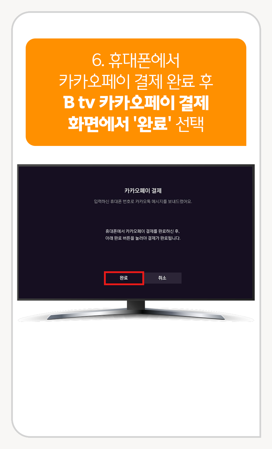 6. 휴대폰에서 카카오페이 결제 완료 후 B tv 카카오페이 결제 화면에서 [완료] 선택