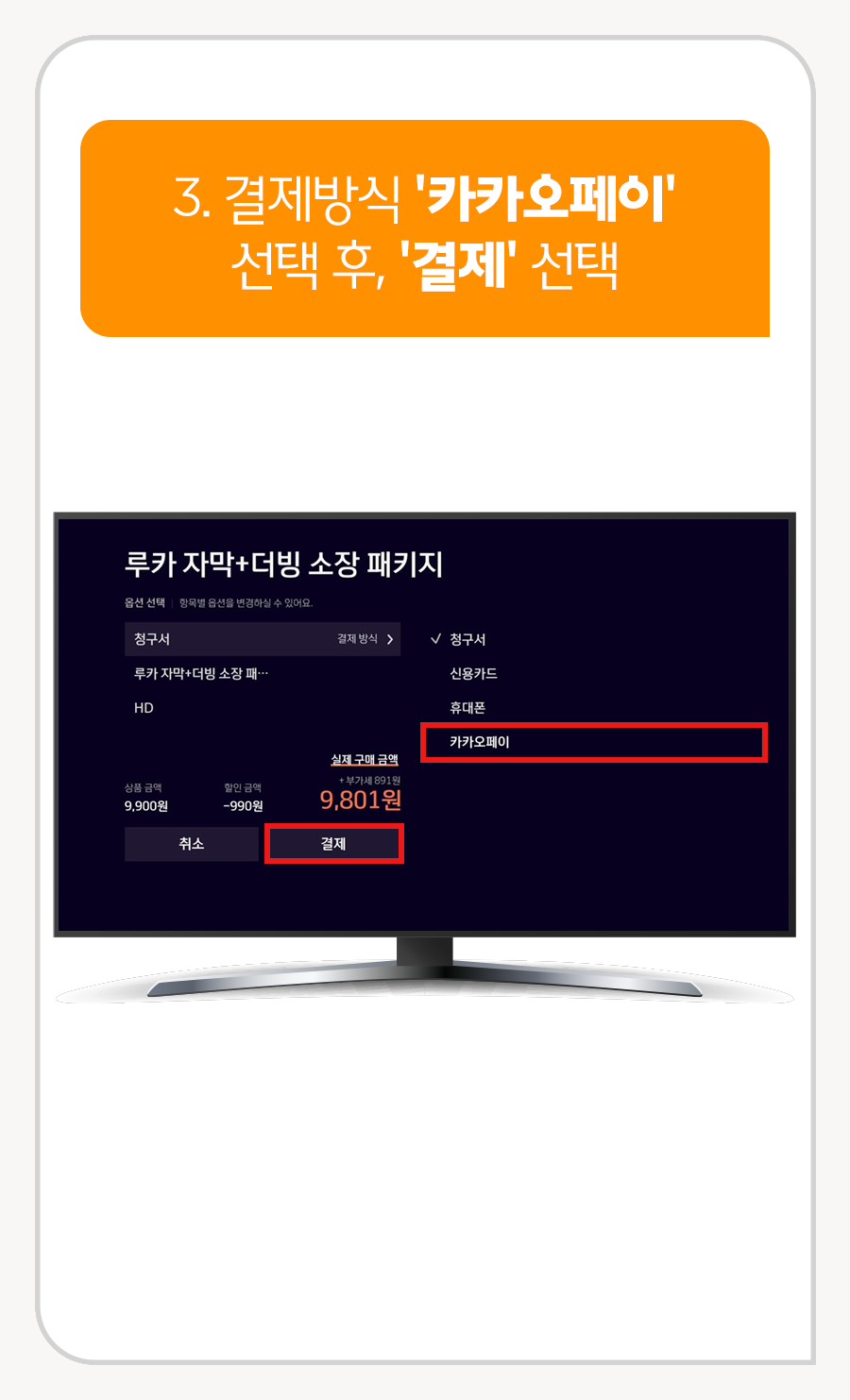 3. 결제방식 [카카오페이] 선택 후, [결제] 선택