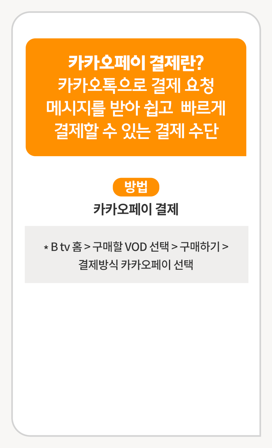 B tv 홈 ▶ 구매할 VOD 선택 ▶ 구매하기 ▶ 결제방식 카카오페이 선택
