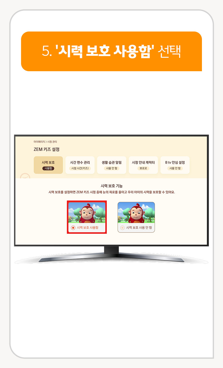 B tv 홈 ▶ MY ▶ 설정 ▶ ZEM 설정 ▶ 시력 보호