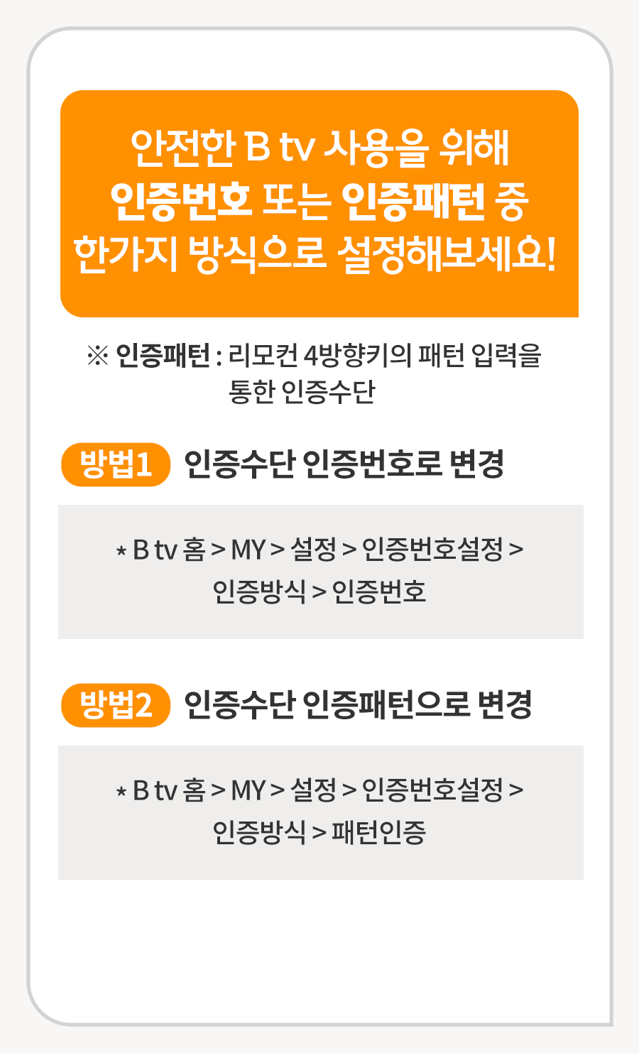 안전한 B tv 사용을 위해 인증번호 또는 인증패턴 중 한가지 방식으로 설정해보세요!