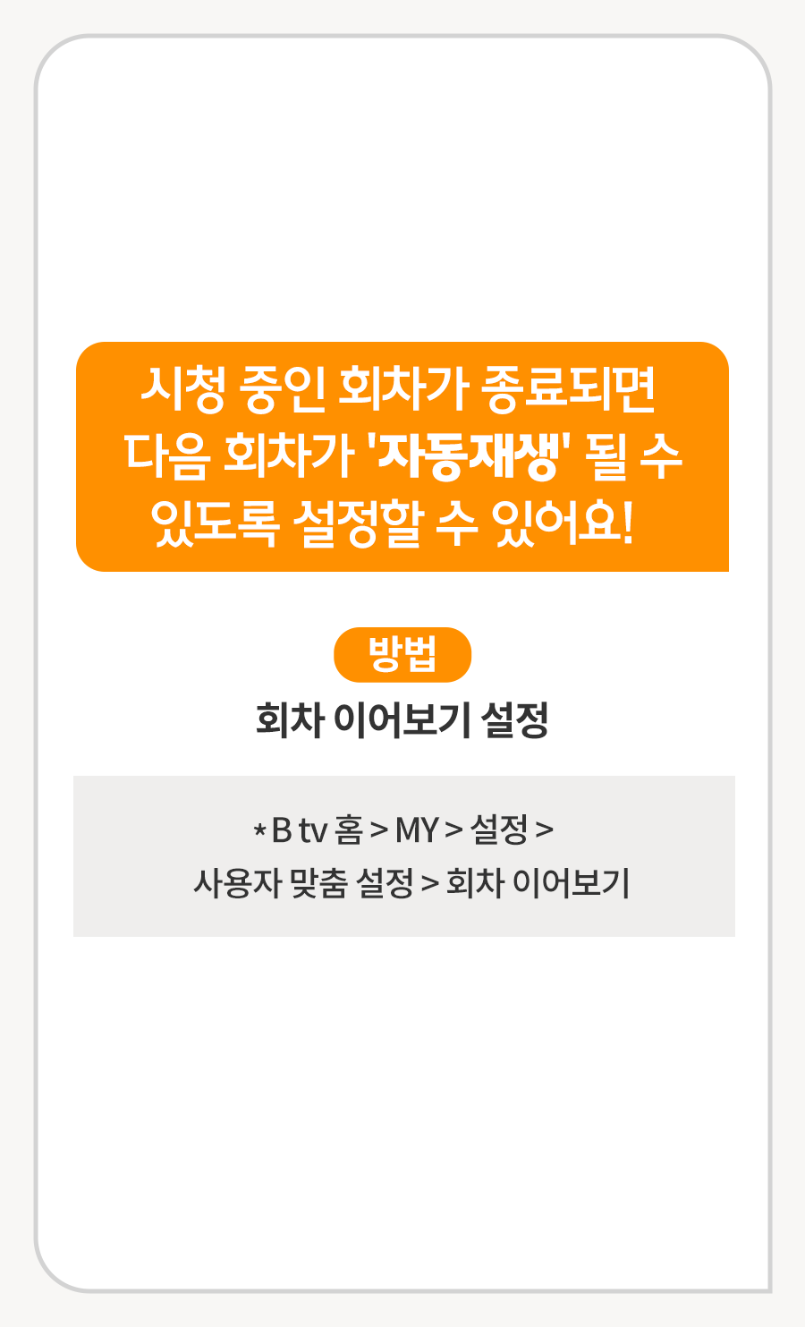 B tv 홈 ▶ MY ▶ 설정 ▶ 사용자 맞춤 설정 ▶ 회차 이어보기