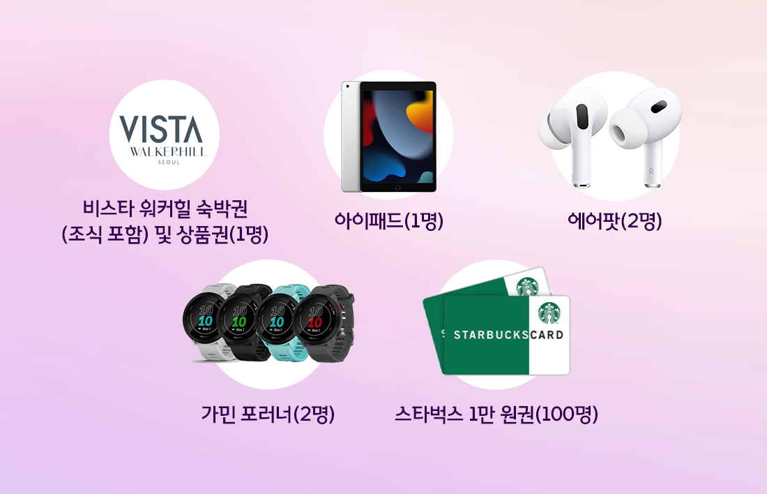 🔸 경품 : 비스타 워커힐 숙박권(조식 포함) 및 상품권(1명), 아이패드(1명), 에어팟(2명), 가민 포러너(2명), 스타벅스 1만원 상품권(100명)