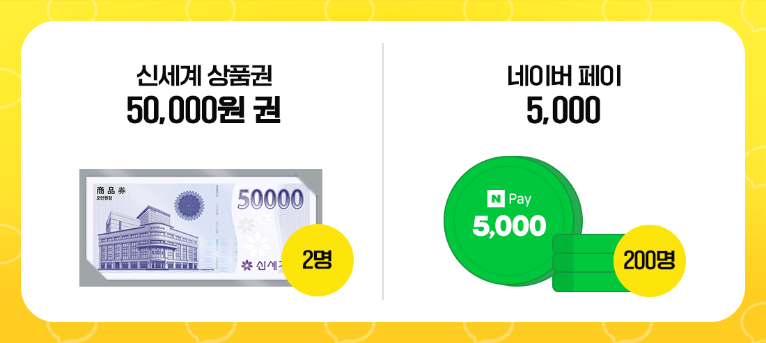 추첨을 통해 신세계 상품권 5만원 권(2명)과 네이버 페이 5천 포인트(200명)도 준비했는데요.