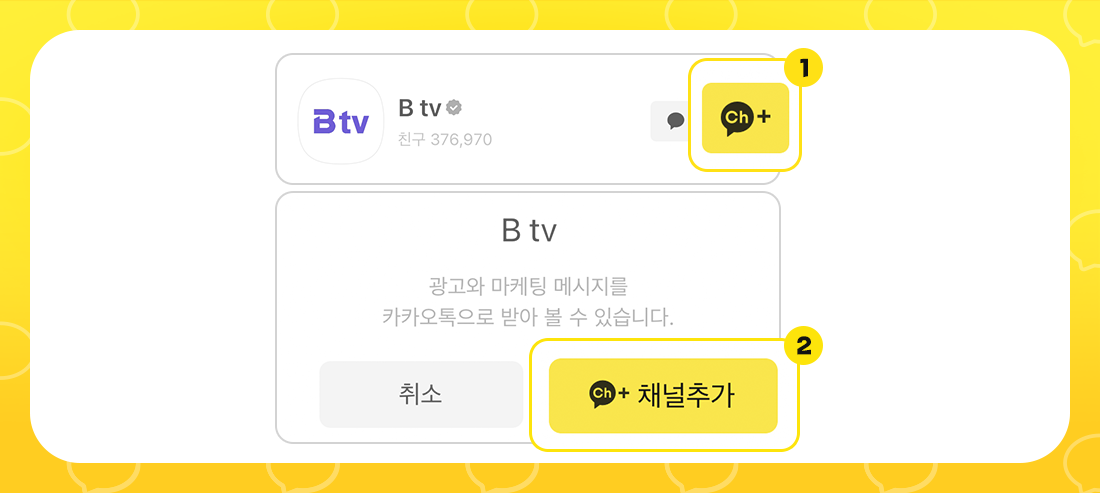 카카오톡 채널에서 B tv를 검색 후, 채널추가를 눌러 B tv와 친구가 되어주세요!