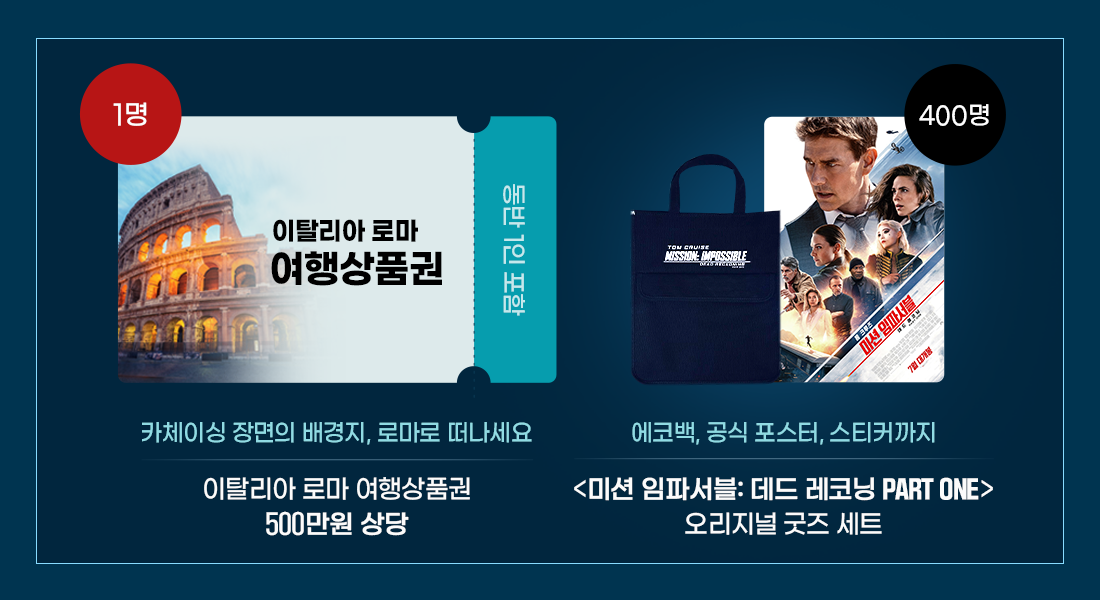 추첨을 통해 500만원 상당의 로마 여행 상품권과 미션 임파서블 오리지널 굿즈 세트를 드려요!
