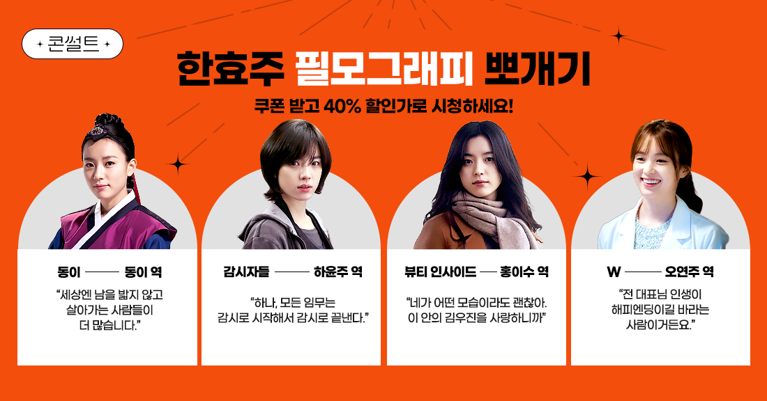 지금 B tv에서 <동이>의 동이, <감시자들>의 하윤주, <뷰티 인사이드>의 홍이수, <W>의 오연주등 한효주 배우 출연작 전용 40% 할인 쿠폰으로 할인 받고 작품 감상하세요!
