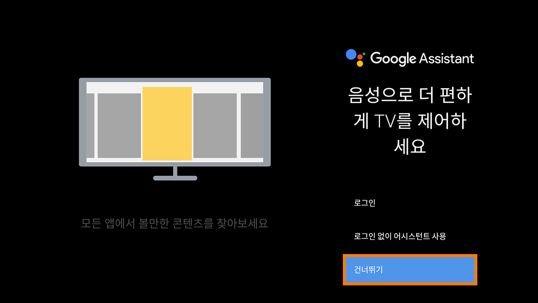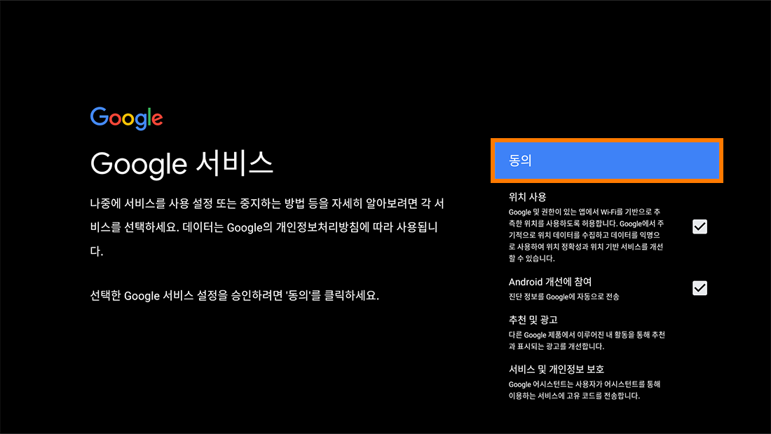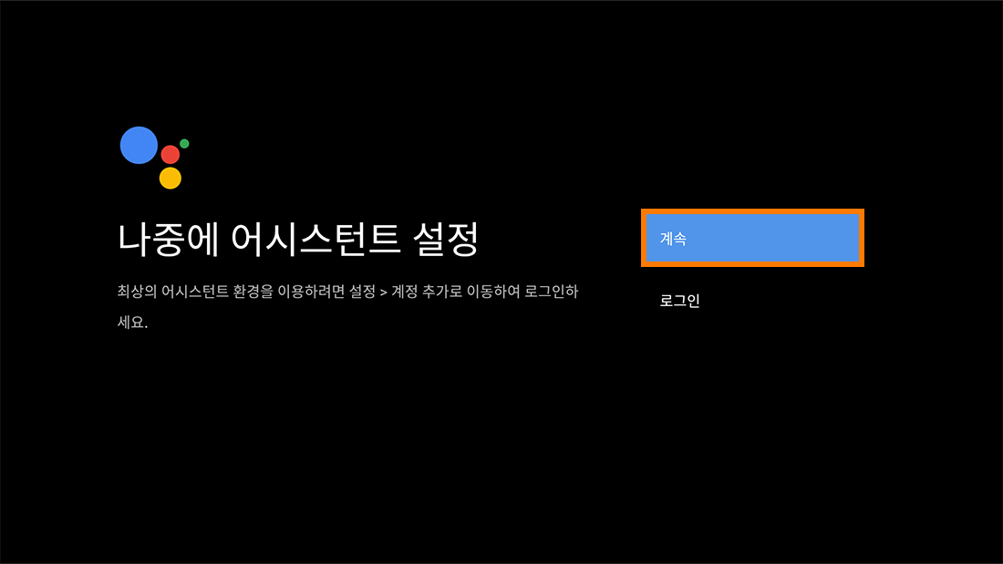 셋톱박스 업데이트 후 구글 설정 화면(총 8개)에서 계속/건너뛰기/동의/허용하셔야 최종 완료됩니다.