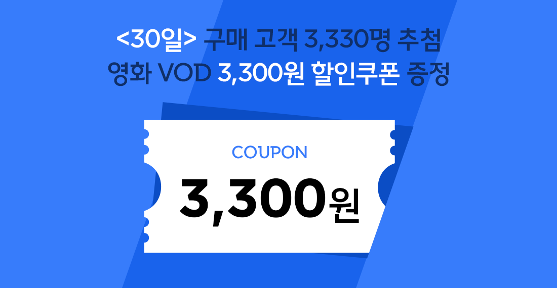 구매 고객을 대상으로 추첨을 통해 총 3,330분께 영화 VOD 3,300원 할인 쿠폰을 드립니다!