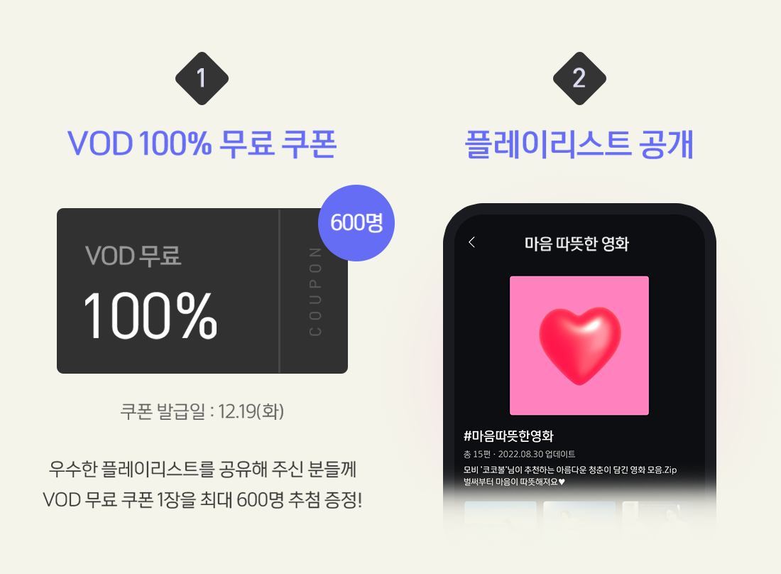 1. VOD 100% 무료 쿠폰 (최대 600명 추첨, 12/19 쿠폰 발급)
