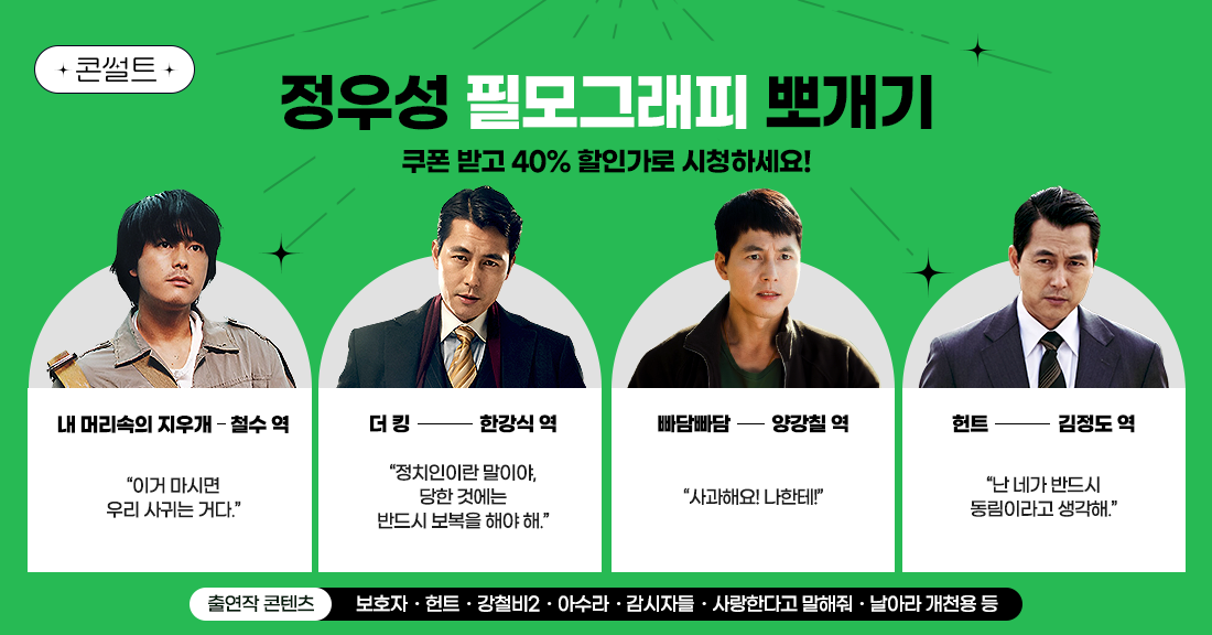 정우성 배우의 필모그래피를 출연작 전용 40% 할인 쿠폰으로 할인받고 B tv에서 감상하세요!