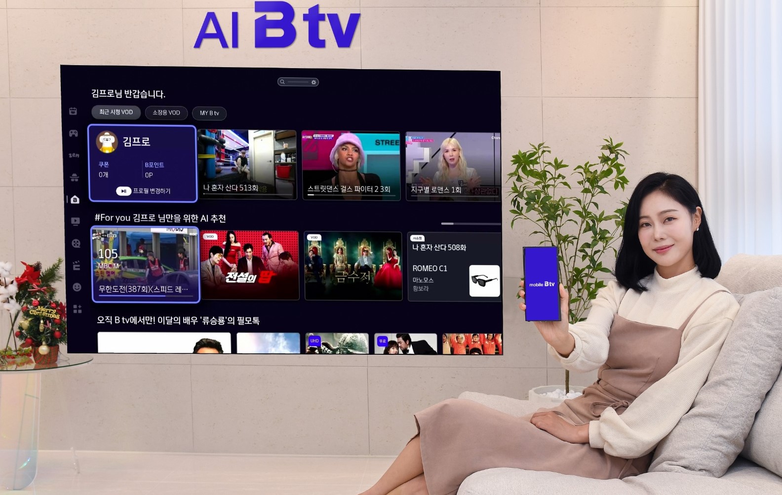 이와 함께 B tv 프로필 기반으로 AI 큐레이션을 통해 시청이력, 추천 콘텐츠, 찜한 VOD, 쇼핑상품 등 개인 맞춤형 메뉴를 제공한다. 여기에 SK ICT 패밀리사의 서비스 이용 이력을 기반으로 B tv에서 이용 가능한 콘텐츠를 자동으로 추천해준다.