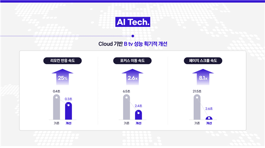 SK브로드밴드는 이번 AI B tv 개편을 위해 차세대 스트리밍 UI를 활용, UI 반응 속도와 메뉴 탐색 속도를 최신 스마트폰의 연산능력 수준으로 끌어올렸다. 그 결과, 이전 대비 ▲리모컨 반응 속도 25% ▲좌우 메뉴 이동 속도 2.6배 ▲상하 페이지 스크롤 속도 8.1배 등 UI 성능을 획기적으로 개선했다.(스마트3 셋톱박스 기준)