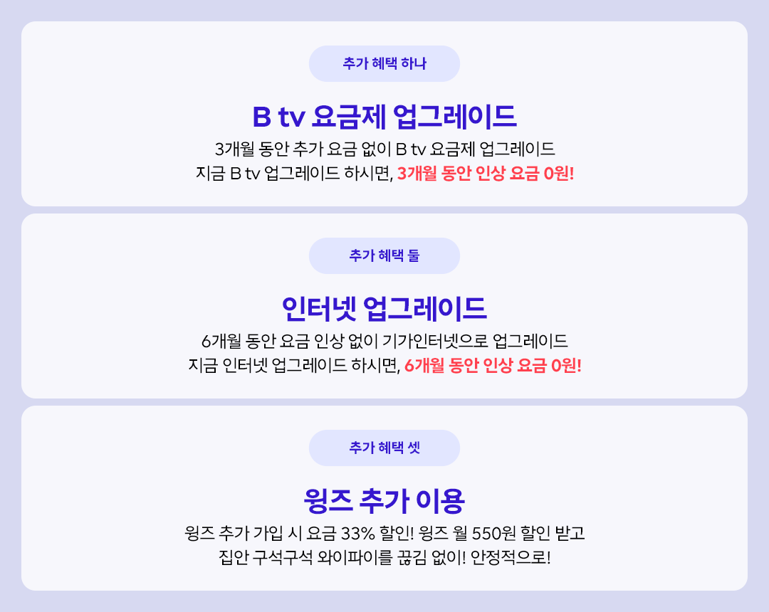B tv 요금제 업그레이드시 3개월 동안 인상 요금 0원!