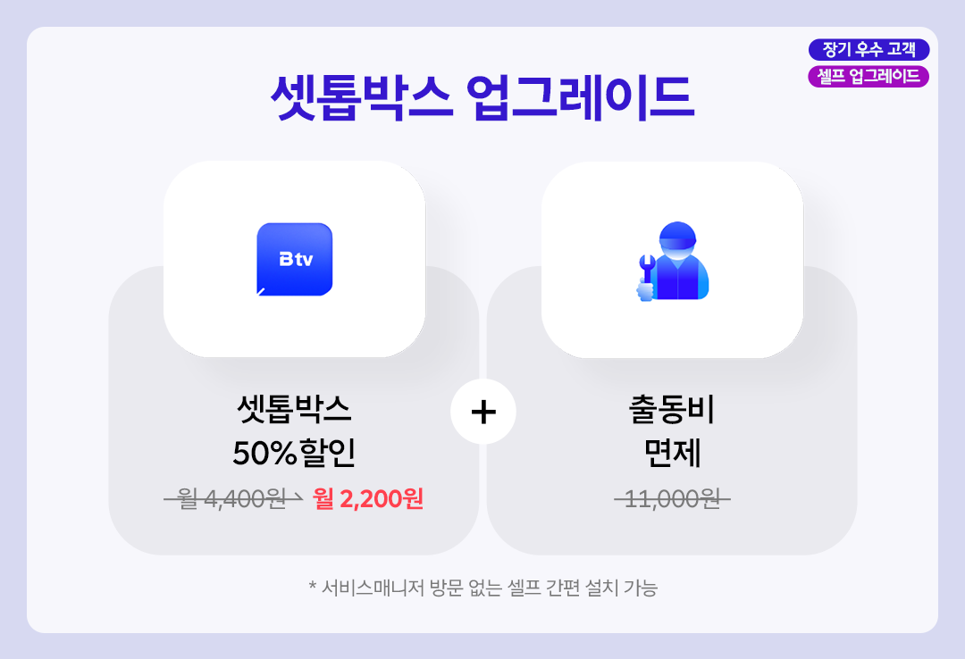 지금 바로 셋톱박스 업그레이드 혜택 확인하고 셀프로 상담없이 신청 및 업그레이드 해보세요!