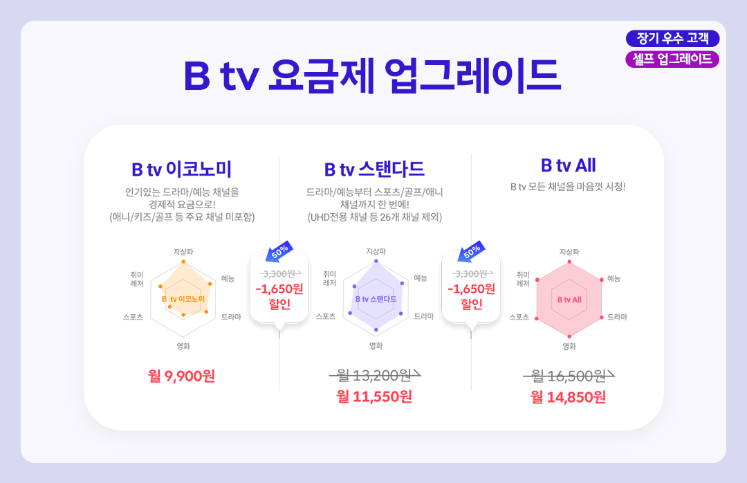 3년 약정으로 B tv를 3년 초과 이용중인 고객님께 B tv 요금제 업그레이드 금액의 50%를 할인해 드립니다!