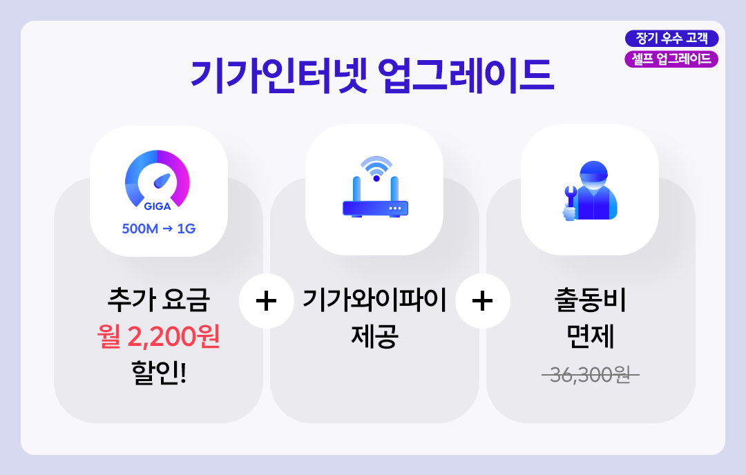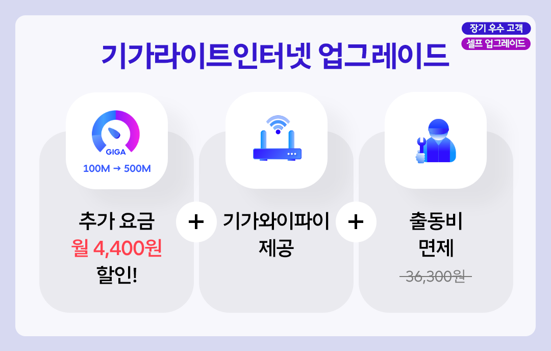 기가인터넷으로 업그레이드를 위한 출동비 면제, 상담없이 셀프 업그레이드 신청도 가능하답니다.
