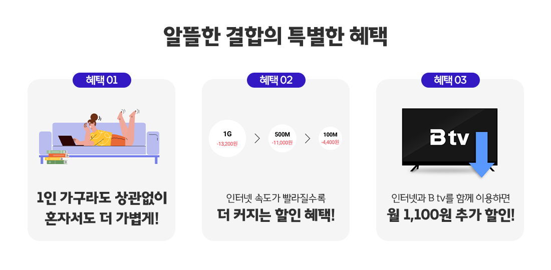혜택 1. 1인 가구라도 요금 부담 없이 알뜰폰과 인터넷을 결합 혜택으로 사용할 수 있어요.