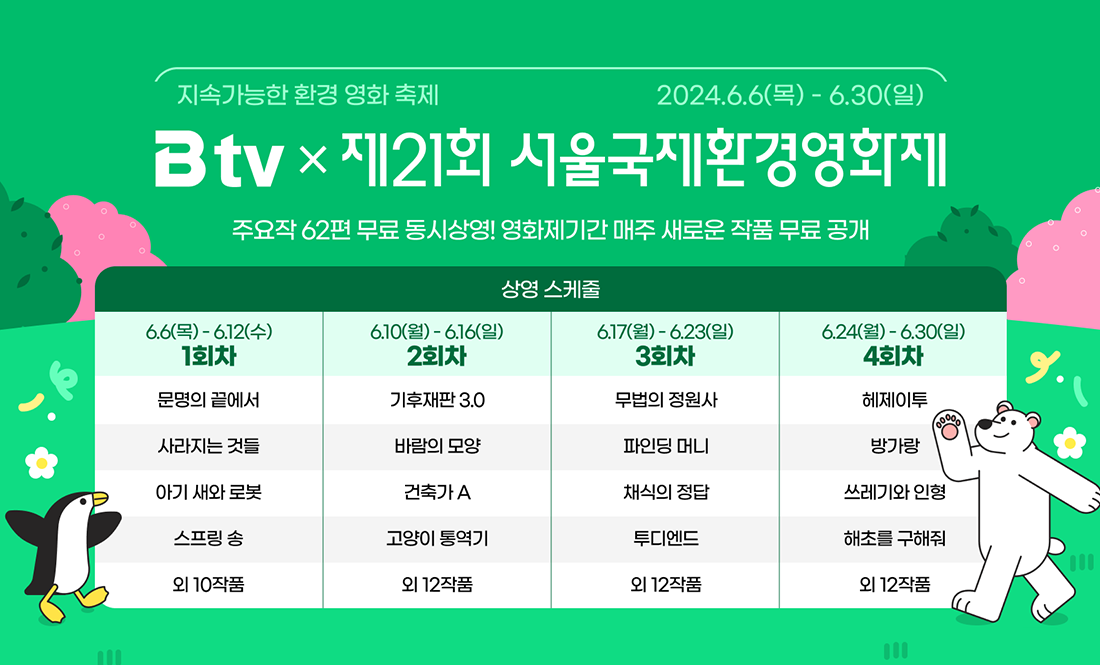 서울국제환경영화제 개막 다음날인 6월 6일부터 B tv에서 상영작을 무료로 시청해 보세요!