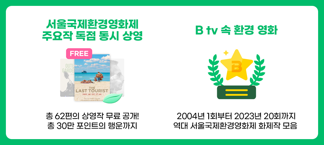 게다가 역대 서울국제환경영화제 화제작을 B tv에서 시청하실 수 있어요!