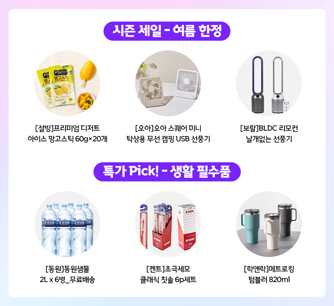 소형가전부터 여름에 꼭 필요한 선풍기, 시원한 간식까지 다양한 상품을 준비했어요.